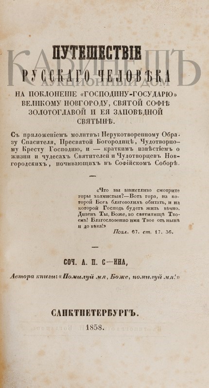 Экземпляр в современном полукожаном переплете. Сохранены обе сторонки издательской шрифтовой обложки. Потертый фрагмент в верхнем поле верхней обложки, редкие пятна. Сведенные штампы и номера на титуле и с. 17, номер орешковыми чернилами на последней странице.