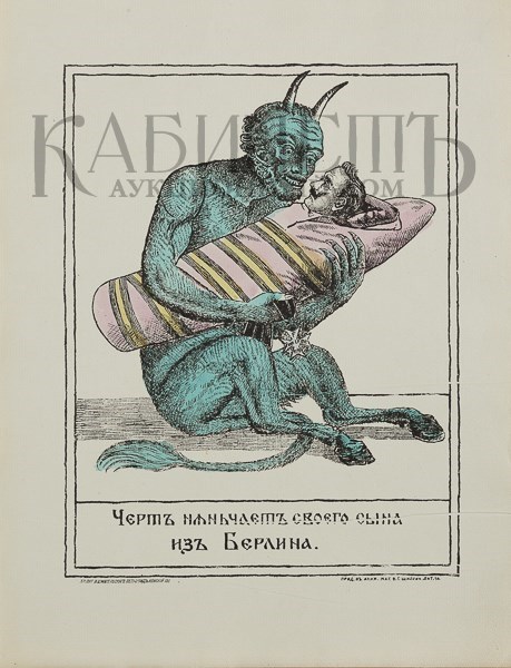 Лубочная картинка. Черт нянчит своего сына из Берлина. Пг., хромолитография В. Шмигельского, 1914 –1915.