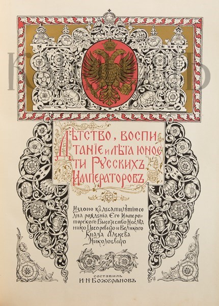 Божерянов И.Н. Детство, воспитание и лета юности Русских императоров. Издание к десятилетию со дня рождения Е.И.В. наследника Цесаревича и Великого князя Алексея Николаевича, Пг., типография А. Бенке, [1915].
