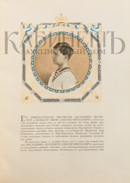 Издание Общества попечения о бесприютных детях, на усиление средств по призрению в учреждениях Приюта имени Ее Императорского Величества Великой Княжны Марии Николаевны детей запасных воинов, призванных для защиты Родины. Книга искусствоведа, писателя, биографа, публициста Ивана Николаевича Божерянова (1852–1919), вышедшая к 10-тилетию со дня рождения его Императорского Высочества Наследника Цесаревича и Великого Князя Алексея Николаевича.