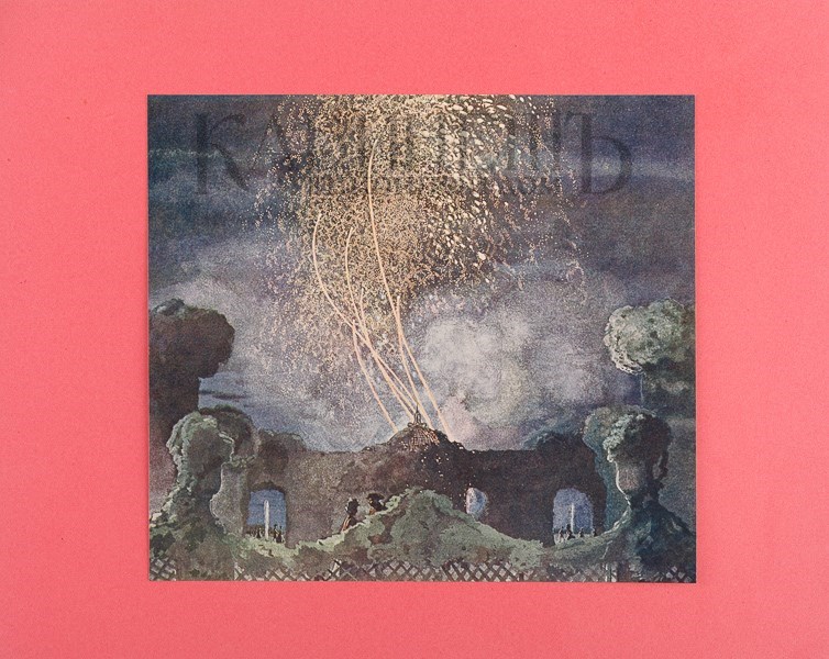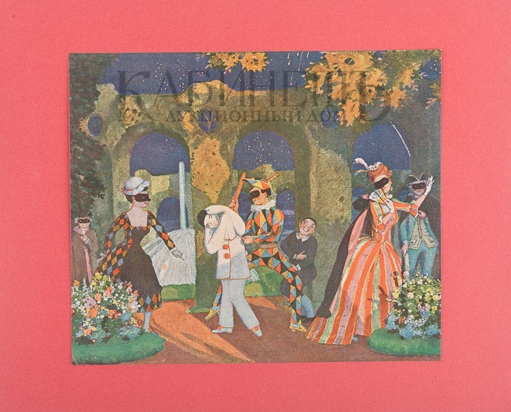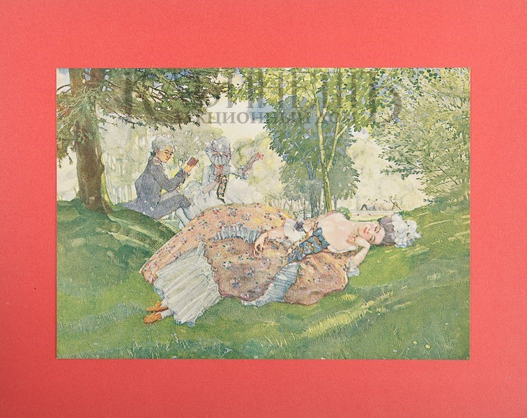 Цветные иллюстрации, наклеенные на розовый картон (картины из собрания Коровина, Боткиной, Морозова и др.).