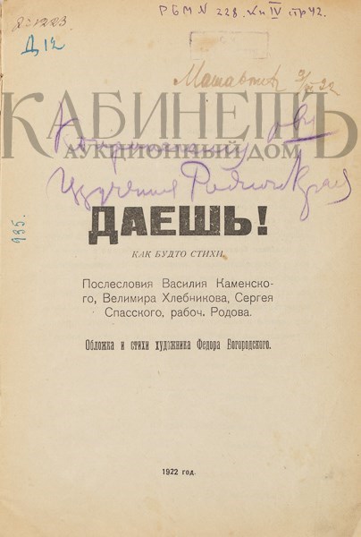 Богородский Ф. Даешь! Как будто стихи. Послесловия Василия Каменского, Велимира Хлебникова, Сергея Спасского, рабочего Родова. Обложка и стихи художника Федора Богородского. Нижний Новгород, Государственное издательство, 1922.