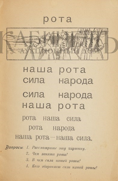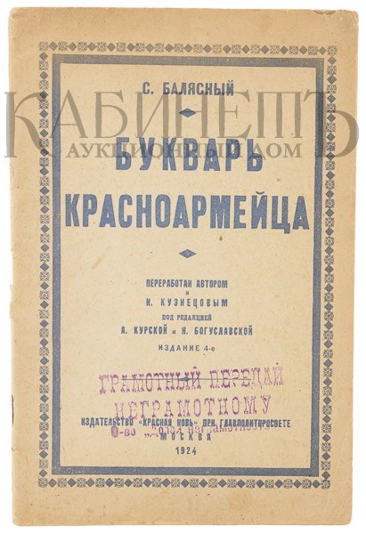 Экземпляр в издательской бумажной обложке, в хорошей сохранности, незначительные потертости, загрязнения, надрывы по корешку. На верхней обложке штамп «Грамотный, передай неграмотному. Общество «Долой неграмотность»».