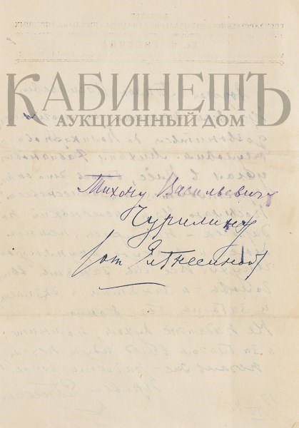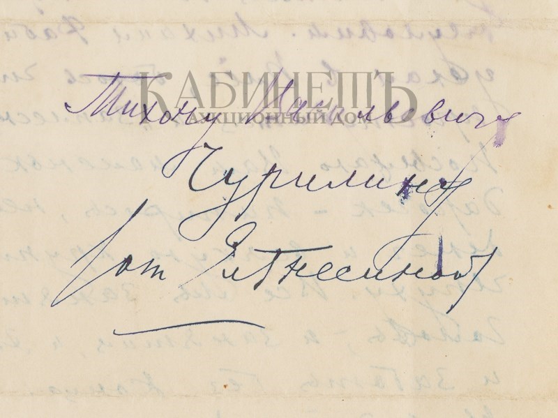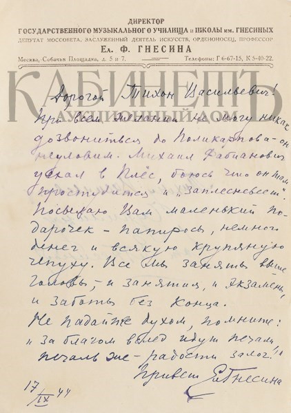Письмо: «Дорогой Тихон Васильевич!/ При всем желании не могу никак/ дозвониться до Поликарпова – он/ неуловим. Михаил Фабианович/ уехал в Плёс, боюсь что он там/ простудится и «заплесневеет»./ Посылаю Вам маленький по-/дарочек – папиросы, немного/ денег и всякую крупяную/ чепуху. Все мы заняты выше/ головы, и занятия, и экзамены,/ и заботы без конца./ Не падайте духом, помните:/ «за благом всего идут печали,/ печаль же – радости залог!»/ Привет Ел. Гнесина / 17/ IX44».