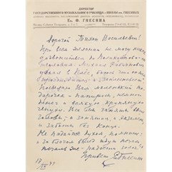 Письмо написано на фирменном бланке Государственного музыкального училища и школы им. Гнесиных.