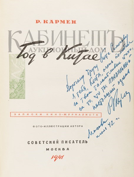 Кармен Р. Год в Китае. Записки кино- журналиста. Фото-иллюстрации автора. М., Советский писатель, 1941.