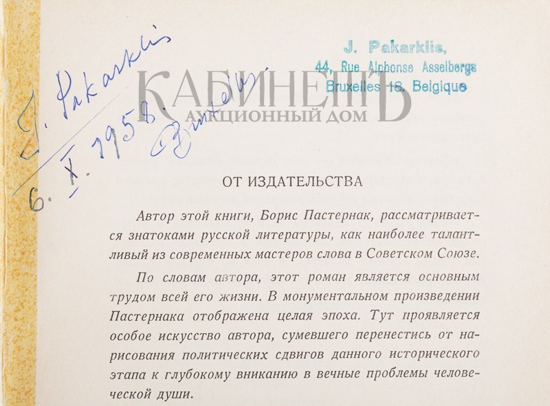 Экземпляр в издательском коленкоровом переплете с золотым тиснением по корешку. Блок расшатан, разлом по корешку внутри книги, следы от реставрации скотчем, отрезан форзац, на первом листе расположен штамповый эксли- брис «J. Pakarklis, 44 Rue Alphonse Asselbergs, Bruxlles 18 Belgique», рядом владельческая пометка синей ручкой.