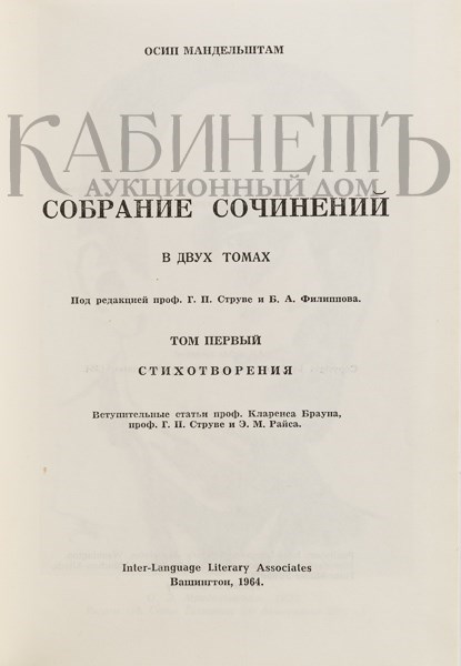 Мандельштам О. Собрание сочинений / Под ред. проф. Г.П. Струве и Б.А. Филиппова. В 4-х томах. [Тома в подборе: том I в переплете; том II – второе издание]. Вашингтон, Международное Литературное Содружество, 1964-1971.