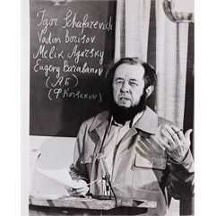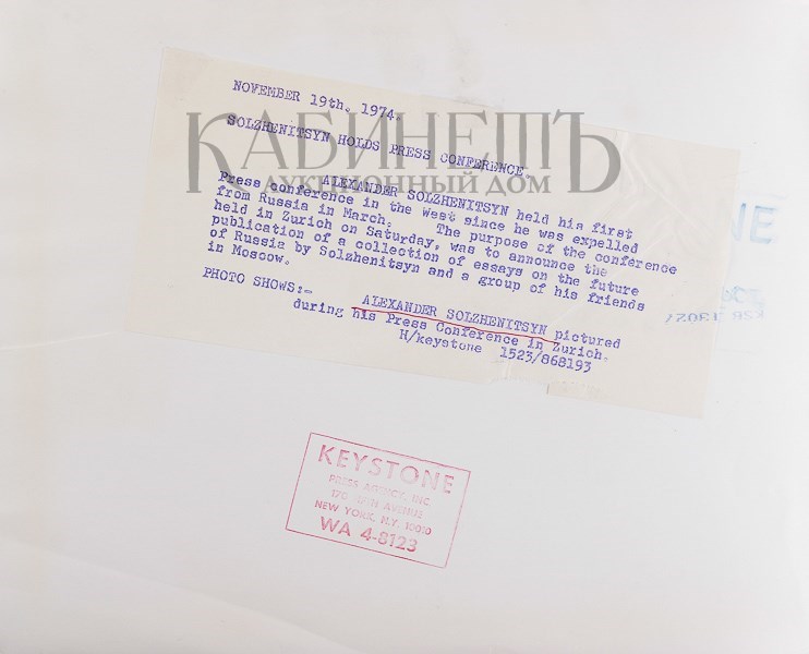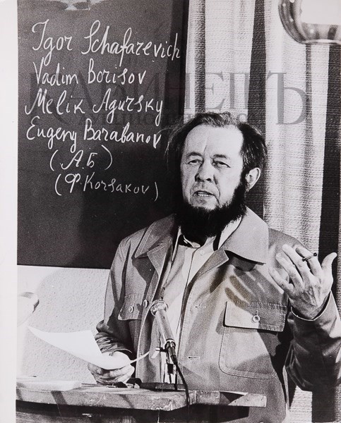 Перепечатка Нобелевской лекции А.И. Солженицына, которая впервые была опубликована в годовом бюллетене Нобелевского комитета в августе 1972 г. Автор предполагал прочесть лекцию в Москве 9 апреля 1972 г., где постоянный секретарь Шведской Академии доктор К.Р. Гиеров должен был вручить ему диплом и медаль. Церемония не состоялась, т.к. секретарю Академии было отказано в визе. Незначительная помятость в левом нижнем уголке фотографии. На обороте наклеен листок с пояснением к фотогра- фии (машинопись).