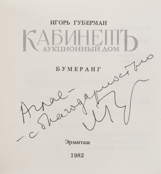 Экземпляр в издательской бумажной обложке, на титульном листе расположен автограф И. Губермана: «Аглае –\– с благодарностью\ И.Губ.»