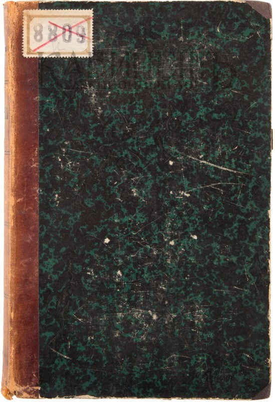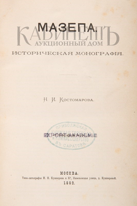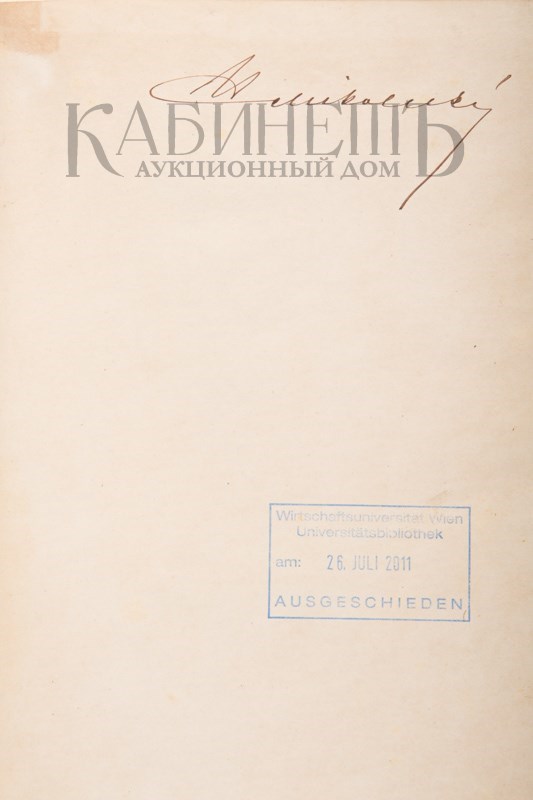 Экземпляр в старинном составном переплете. Дореволюционная бумажная наклейка с номером на верхней крышке. Потертости переплета, «лисьи» пятна. Штамп переплетчика М. Буймистрова в Киеве на форзаце. Зарубежная библиотечная печать на свободном листе форзаца, дореволюционный книготорговый штамп и зарубежная печать на титульном листе. Некоторые листы – мытые.
