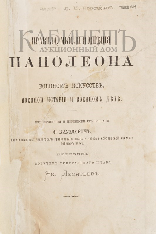 Экземпляр в современном полукожаном переплете с золотым тиснением по корешку. Авантитул реставрирован, на нем расположен штамповый экслибрис: «Л.М. Корсаков». Загрязнения, пятна, последняя страница дублирована на бумагу, на ней расположен штамп книжного магазина.