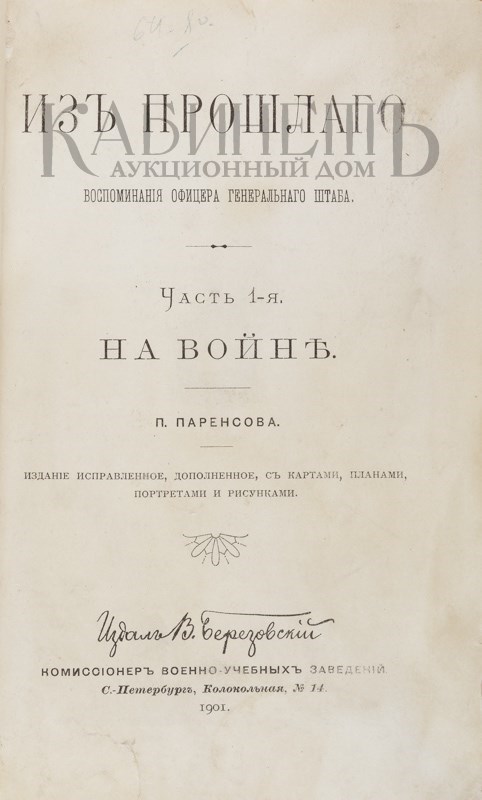 Паренсов П. Из прошлого. Воспоминания офицера генерального штаба. Часть I [из 5 частей в 3-х томах]. Издание исправленное, дополненное, с картами, планами, портретами и рисунками. СПб., издал В. Березовский, комиссионер военно- учебных заведений, 1901.