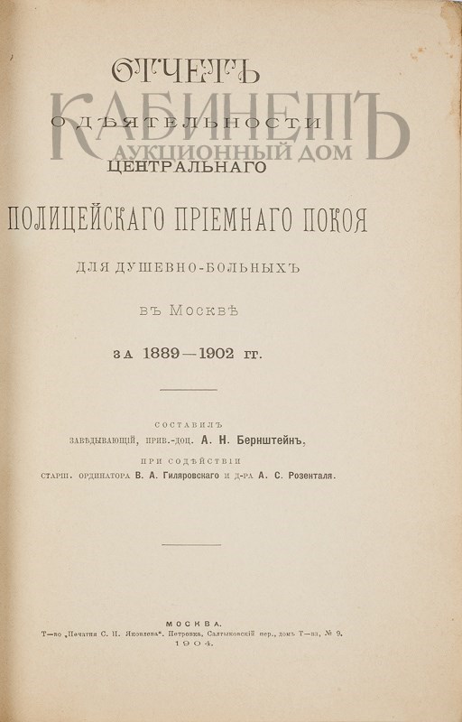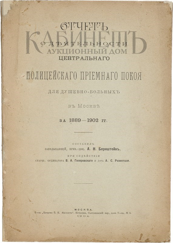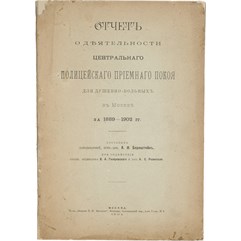 Отчет о деятельности Центрального полицейского приемного покоя для душевнобольных в Москве за 1889–1902 гг. М., т-во «Печатня С.П. Яковлева», 1904.