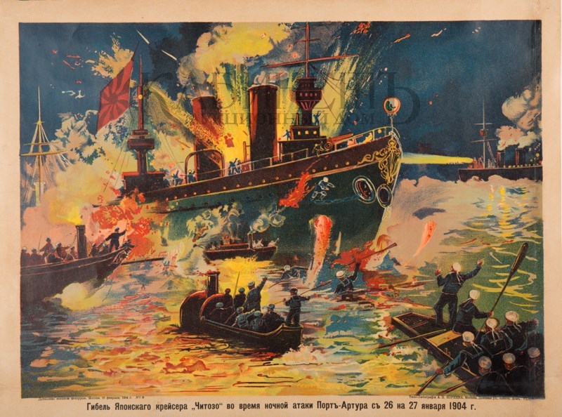 Лубочная картинка. Гибель японского крейсера «Читозо» во время ночной атаки Порт-Артура с 26 на 27 января 1904 г. М., Типо-Литография А.П. Коркина, 1904 – 1905.