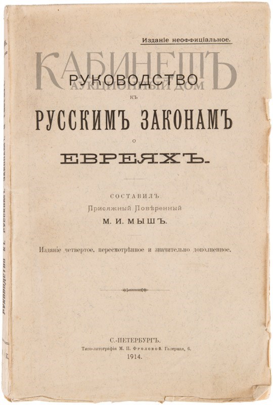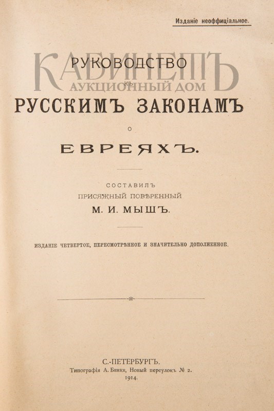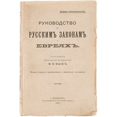 Мыш М.И. Руководство к русским законам о евреях. Издание четвертое. Издание неофициальное. СПб., типография А. Бенке, 1914.