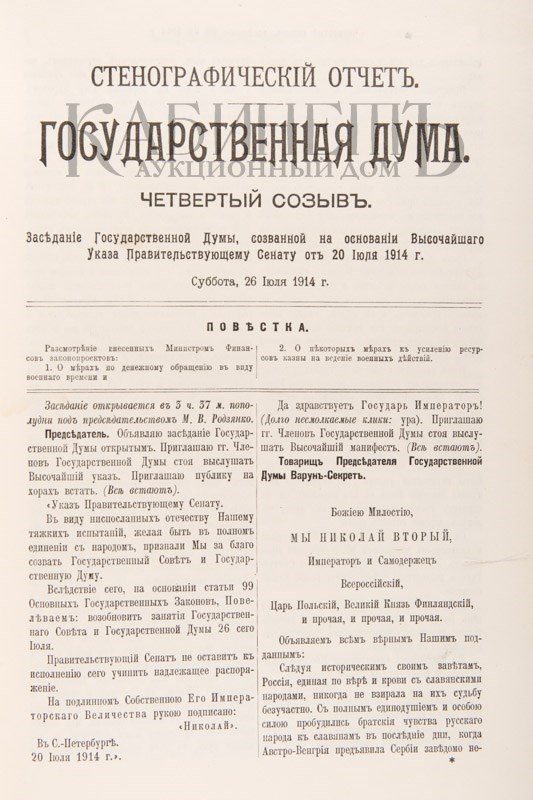 Издание посвящено экстренному заседанию Государственной Думы четвертого созыва в связи с началом Первой мировой войны. Через два дня Россия вступила в войну.