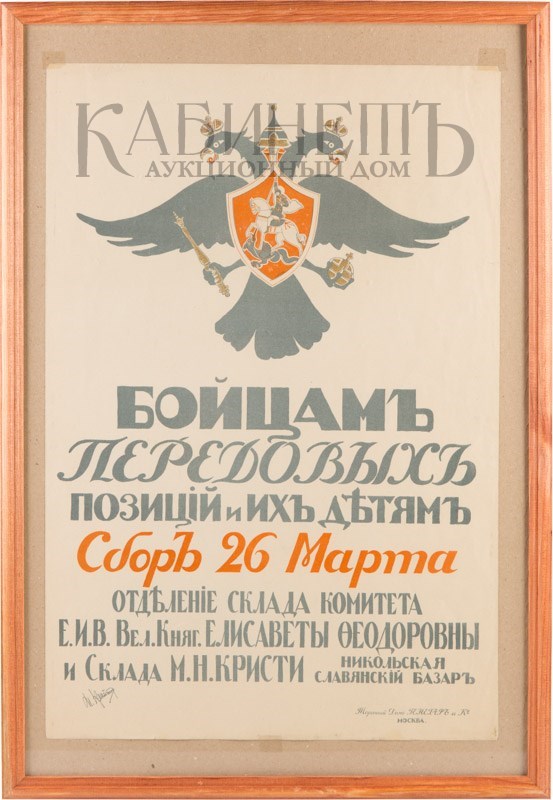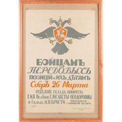 Плакат. «Бойцам передовых позиций и их детям. Сбор 26 марта». Отделение склада комитета ЕИВ Вел. Кн. Елизаветы Феодоровны и склада М.Н. Кристи. Художник И.К. Крайтор. М., Торговый дом Генегар и Ко., 1915.