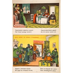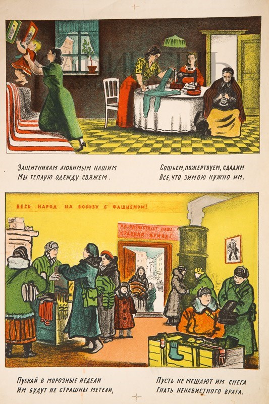 Лубочная картинка. Автор Ю. Васнецов. Защитникам любимым нашим мы теплую одежду свяжем. [Б.м.и., 1940-е гг.].
