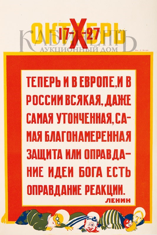 3) Моор Д. Октябрь X. 17–27. Теперь и в Европе и в России всякая, даже самая утонченная, самая благонамеренная защита или оправдание идеи Бога есть оправдание реакции. Ленин. Размер: 35,5 х 28 см;