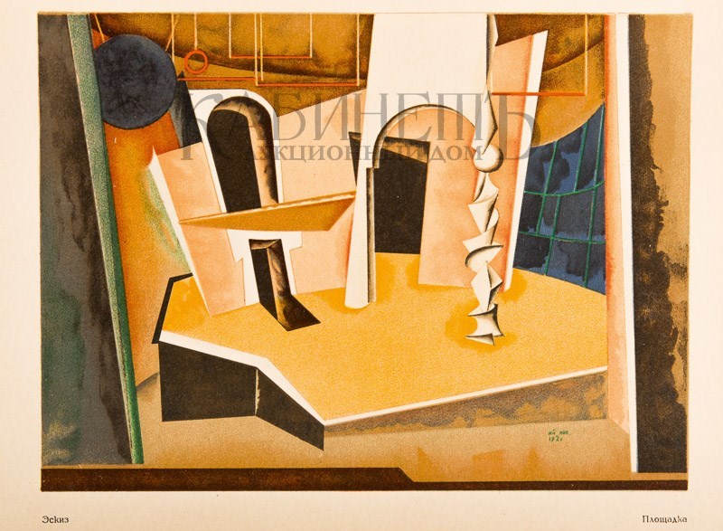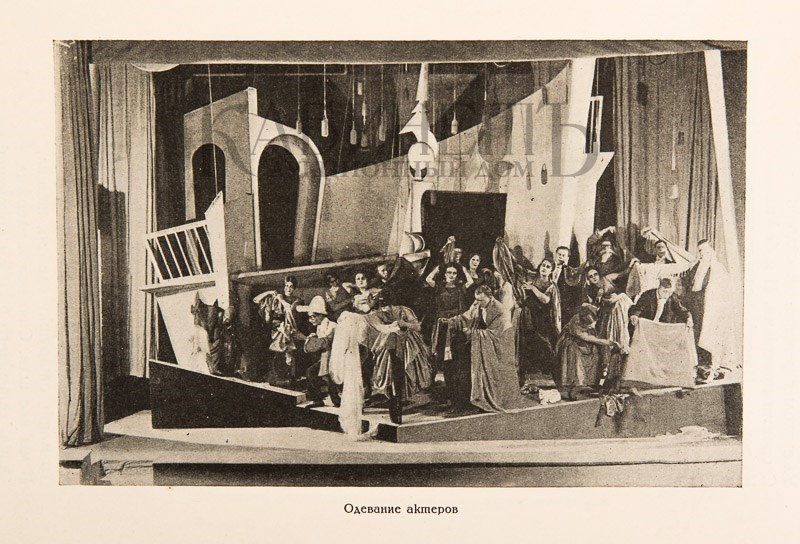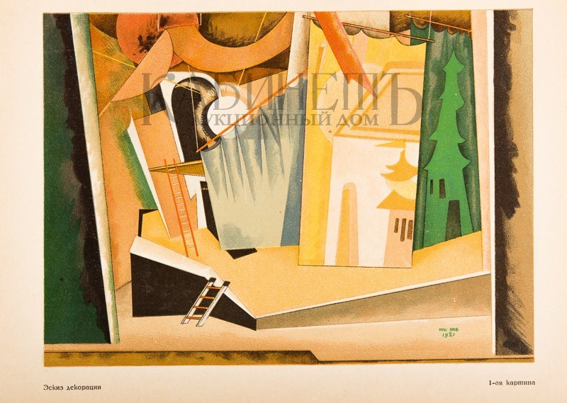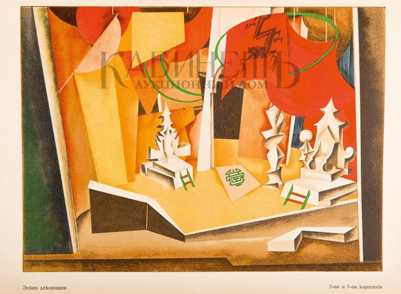 Обложка, виньетки, эскизы декораций и костюмов выполнены в стиле конструктивизма Игн. Нивинским.