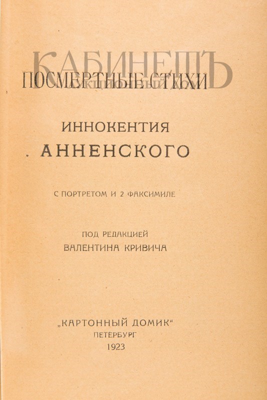 Анненский И. Посмертные стихи Иннокентия Анненского. С портретом и 2 факсимиле. Пг., «Картонный домик», 1923.