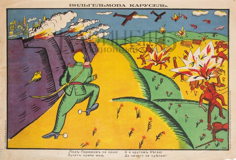 Лубочная картинка. Автор К. Малевич. Текст В. Маяковского. «Вильгельмова карусель. Под Парижем на краю лупят армию мою, а я кругом бегаю, да ничего не сделаю». М., издательство «Сегодняшний лубок», типо- литография С.М. Мухарского, 1914–1915.