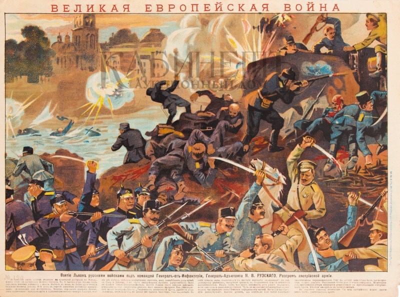 Лубочная картинка. «Великая Европейская война. Взятие львова русскими войсками под командой Генерал-от Инфантерии, Генерал-Адъютанта Н. В. Рузского. Разгром австрийской армии». №190. М., Литография т/д А. Коркин, А. Байдеман и Ко, 1914–1915.