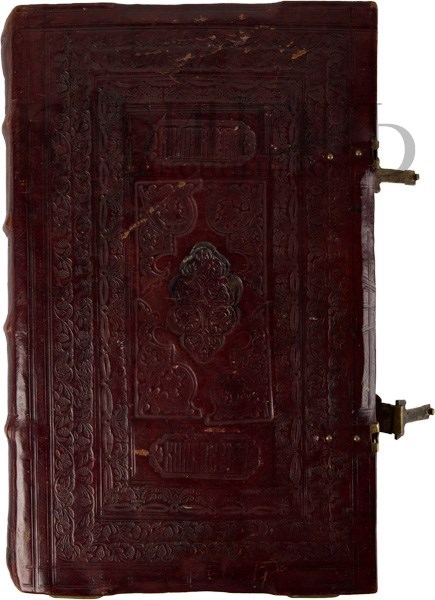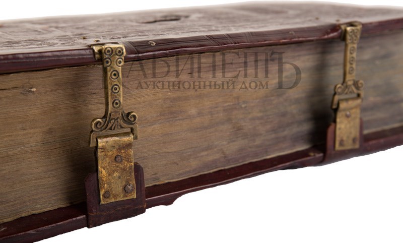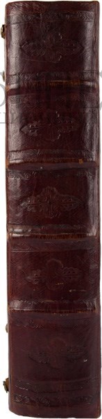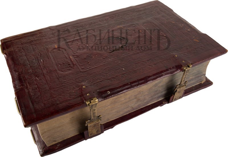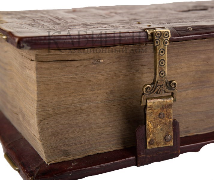 Экземпляр в старинном цельнокожаном переплете конца XIX начала XX века, доски обтянуты кожей, латунные замки, профессиональная реставрация страниц, разлом по корешку внутри книги реставрирован тканью.