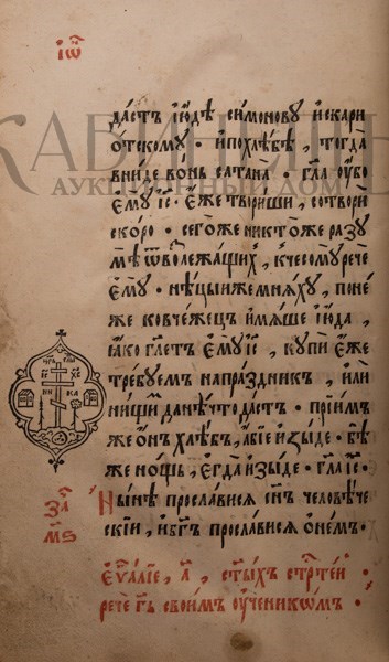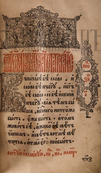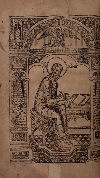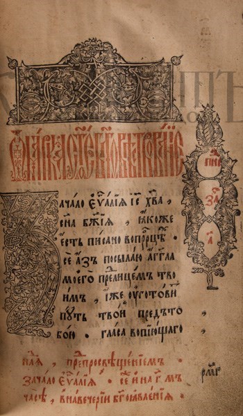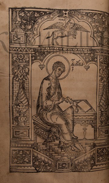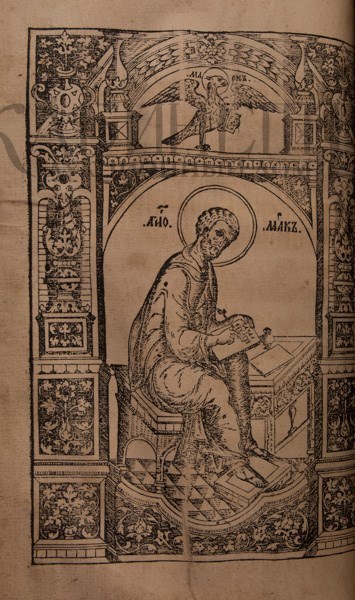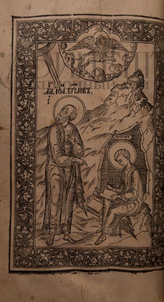 Третье издание Евангелия Московского печатного двора. Кирилловская печать в 2 краски. На церковно - славянском языке. 5 гравюр на дереве по рисункам Прокопия Чирина: 4 гравюры евангелистов и эмблема распятия.