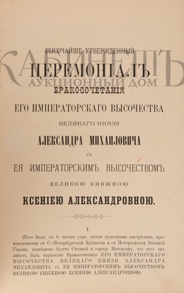 Высочайше утвержденный церемониал бракосочетания Его Императорского Высочества Великого князя Александра Михайловича с Ее Императорским Высочеством Великой княжной Ксенией Александровной. СПб., Типография Тренке и Фосно,[1894].