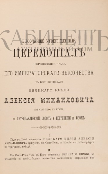Высочайше утвержденный церемониал перевезения тела Его Императорского Высочества в Бозе почившего Великого князя Алексея Михайловича из Сан-Ремо в Италии в Петропавловский собор и погребения в оном. СПб., Типография Тренке и Фосно,[1895].