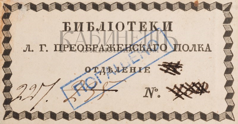 Экземпляр в полукожаном переплете XIX века. Потертости, стертые надписи на авантитуле, титульном листе, с. 17 подклеена. На форзаце экслибрис библиотеки Преображенского Полка со штампом «Погашено».