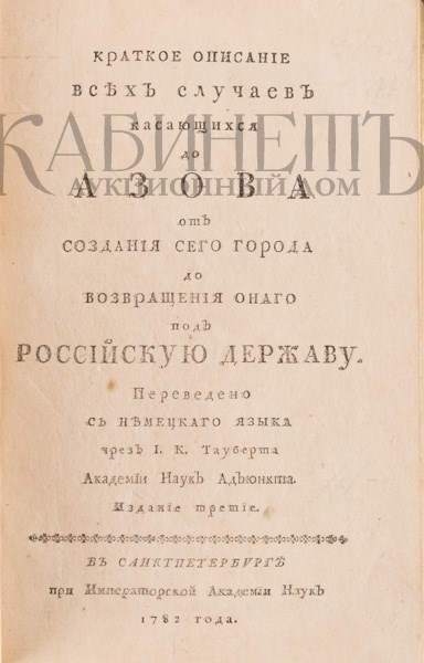 [Байер, Г.-З.] Краткое описание всех случаев, касающихся до Азова, от создания сего города до возвращения оного под Российскую державу. Переведено с немецкого чрез И.К. Тауберта, Академии наук адъюнкта. Издание третье. СПб., при Императорской Академии наук, 1782.