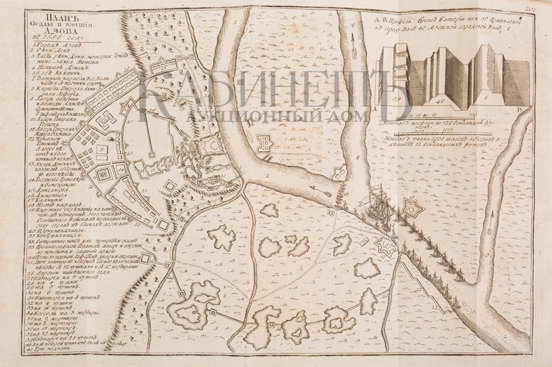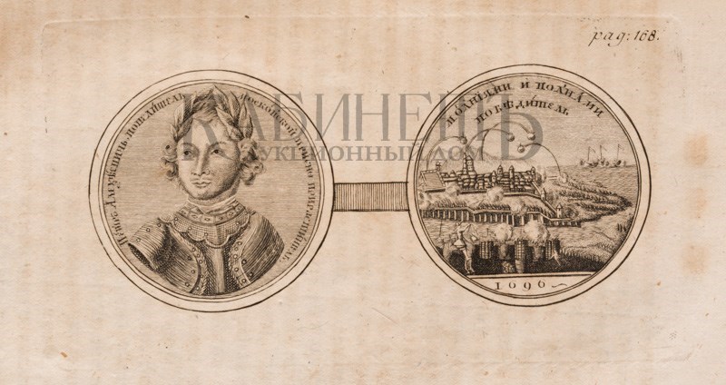 Две гравюры – изображение медали «Молниями и волнами победитель» и портрет Петра I; «План осады и взятия Азова в 1696 году».
