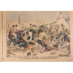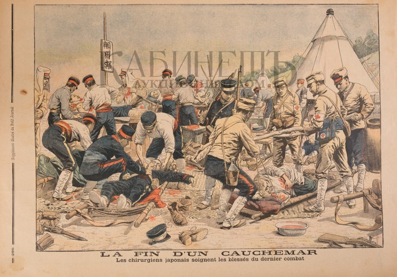 La fin d`un cauchemar. Les chirurgiens japonais soignent les blessés du dernier combat. № 296. Supplement illustre du Petit Journal.[Лубочная картинка. Русско-японская война. Конец кошмара. Японские хирурги оказывают помощь раненым после последнего боя. №296. Иллюстрация к газете «Маленький журнал»,1904–1905].