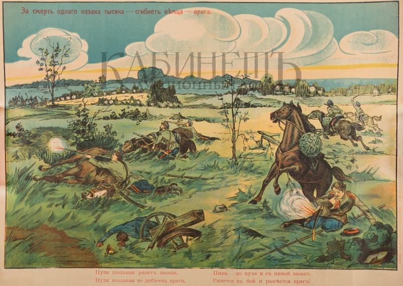 Лубочная картинка. За смерть одного казака – тысяча сгибнет немца-врага. М., типо-литография П.А. Прокуронова, Н.И. Горюнова, 1914.