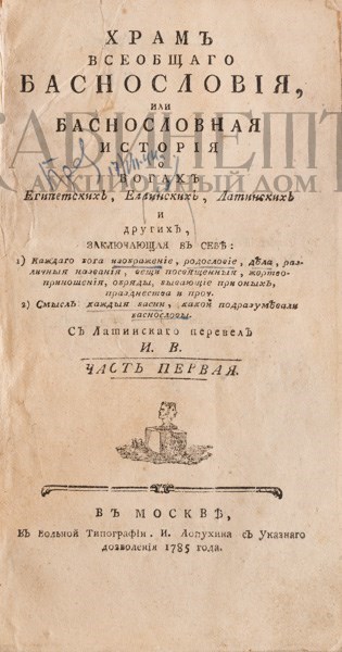Архив аукциона №25(75) Лот 17 Помей Ф.А. Храм всеобщего баснословия, или баснословная история о богах египетских, еллинских, латинских и других, заключающая в себе: 1) каждого бога изображение, родословие, дела, различные названия, вещи посвященные, жертвоприношения, обряды, бывающие при оных, празднества и проч. 2) смысл каждой басни, какой подразумевали баснословы. С латинского перевел И[ван] В[иноградов]. В 3-х частях. М., в Вольной типографии И. Лопухина, 1785.