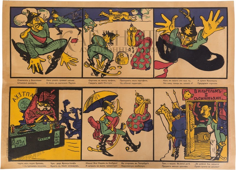 Лубочная картинка. «Отвалилось у Вильгельма штыковое рыжеусье...». Текст [В. Маяковского]. М., издательство «Сегодняшний лубок», Типо-литография С. Мухарского, [1914].