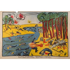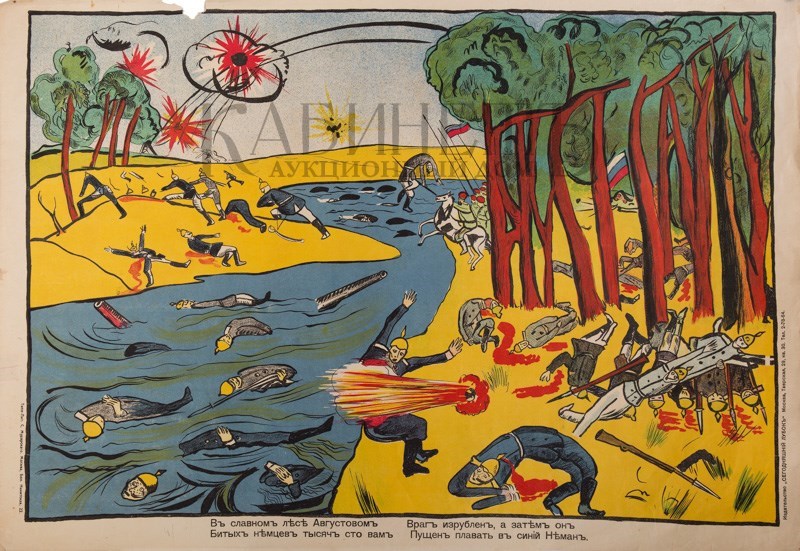 Архив аукциона №25(75) Лот 188 Лубочная картинка. Неизвестный художник. Текст В. Маяковского. «В славном лесе Августовом битых немцев тысяч сто вам. Враг изрублен, а затем он пущен плавать в синий Неман». М., издательство «Сегодняшний лубок»,типо-литография С.М. Мухарского, 1914.