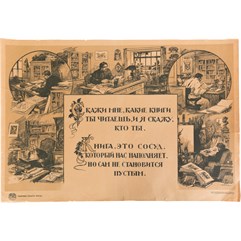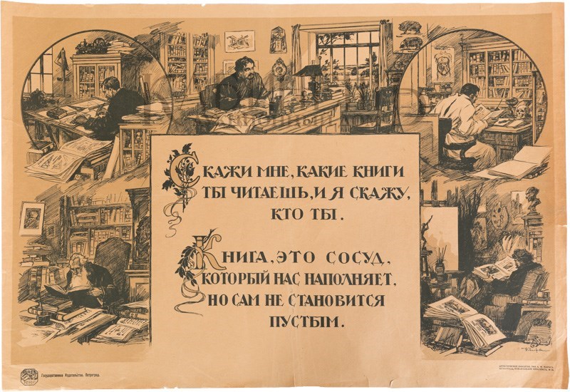 Архив аукциона №25(75) Лот 193 Плакат. Художник И. Симаков. «Скажи мне, какие книги ты читаешь, и я скажу, кто ты. Книга, это сосуд, который нас наполняет, но сам не становится пустым». Пг., Государственное издательство, Артистическое заведение товарищества А.Ф. Маркс, [1917].