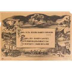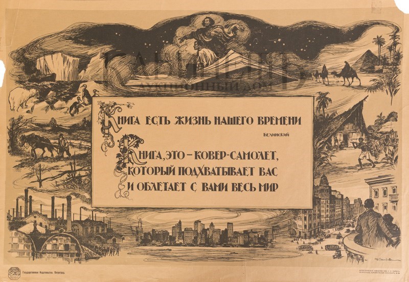 Плакат. Художник И. Симаков. «Книга есть жизнь нашего времени. Книга, это ковер-самолет, который подхватывает вас и облетает с вами весь мир». Пг., Государственное издательство, Артистическое заведение товарищества А.Ф. Маркс, [1917].