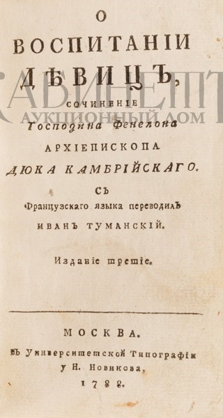 [Фенелон Франсуа де Салиньяк де Ла Мот]. О воспитании девиц, сочинение господина Фенелона архиепископа Дюка Камбрийского. С французского языка перевел Иван Туманский. Издание третье. М., в Университетской типографии у Н. Новикова, 1788.