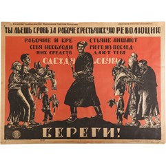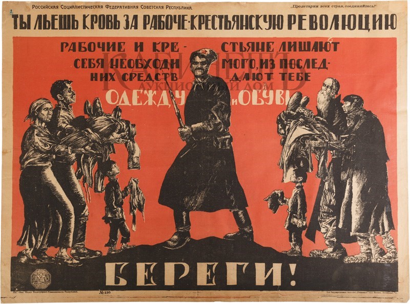 Архив аукциона №25(75) Лот 204 Плакат. Автор Д. Моор. «Ты льешь кровь за рабоче-крестьянскую революцию. Рабочие и крестьяне лишают себя необходимого, из последних средств дают тебе одежду и обувь. Береги!» № 116. М., 1-я Государственная типо-литография, [1920].