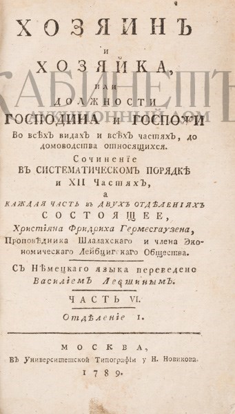 Хозяин и хозяйка, или Должности господина и госпожи во всех видах и всех частях, до домоводства относящихся. Сочинение в систематическом порядке и XII частях, а каждая часть в двух отделениях состоящее, Християна Фридриха Гермесгаузена, проповедника Шлалахского и члена Экономического Лейпцигского общества. С немецкого языка переведено Василием Левшиным. Часть I, IV, VI [Из 12-ти частей]. М., в Университетской типографии, у Н.Новикова, 1789.