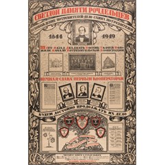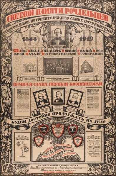 Плакат. Художники И. Рерберг, П. Я. Павлинов. «Светлой памяти Рочдельцев. Освобождение потребителей – дело самих потребителей 1844 –1919. 75 лет назад двадцать восемь ткачей положили начало потребительской кооперации. Вечная слава первым кооператорам. Читайте книги о Рочдельцах». [М.], издание Центросоюза,№ 37, 2-я типо-литография МГСНХ, [Х 1919].