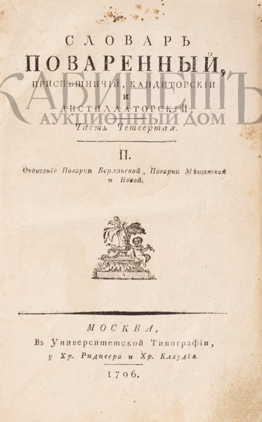 [Левшин В.А.]. Словарь поваренный, приспешничий, кондитерский и дистиллаторский. Часть IV. [Из 6-ти]. М., в Университетской типографии у Хр. Ридигера и Хр. Клаудия, 1796.
