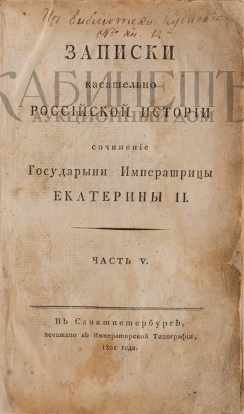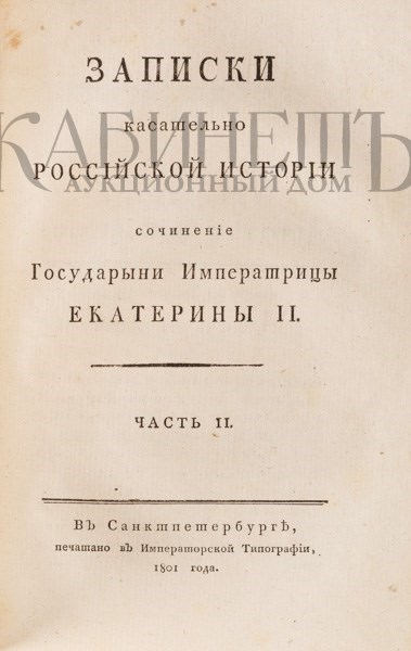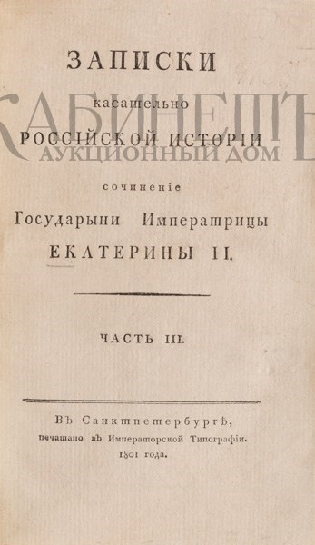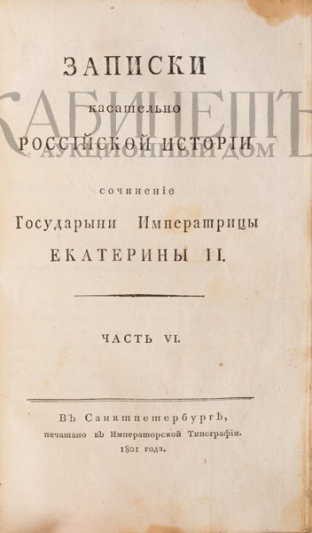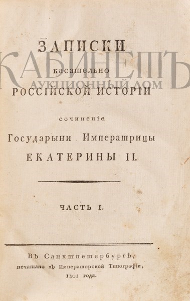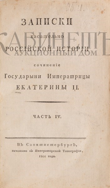 [Екатерина II]. Записки касательно Российской истории. Сочинение Государыни Императрицы Екатерины II. В 6 частях, 4 томах. СПб., печатано в Императорской Типографии, 1801.