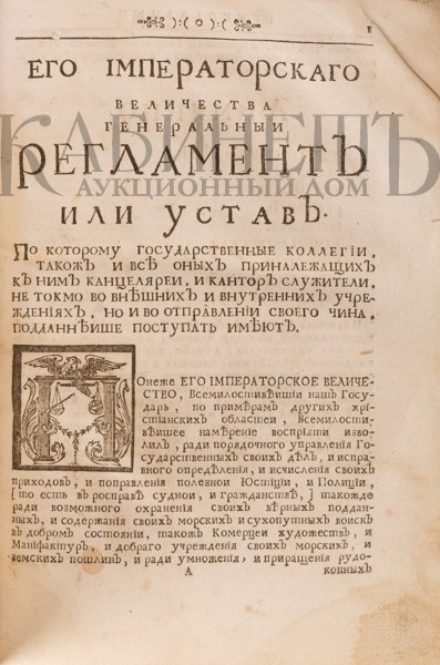 2) Его Императорского Величества Регламент или устав. По которому государственные коллегии, також и все оные приналежащие к ним канцелярии, и контор служители, не токмо во внешних и внутренних учреждениях, но и во отправлении своего чина, подданнейше поступать имеют.СПб., печатан повелением Ея Императорского Величества в Санктпетербурге при Императорской Академии наук, 1735.