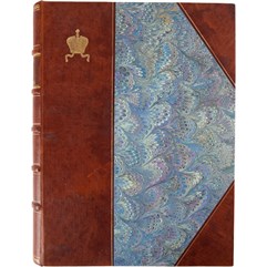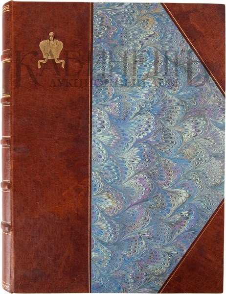 Экземпляр в современном цельнокожаном переплете с золотым тиснением по верхней крышке и корешку. Бинты. Форзацы из бумаги с геометрическим и растительным орнаментом. Потертости в нижнем поле форзаца, реставрация уголка с. 7-8, незначительные загрязнения.